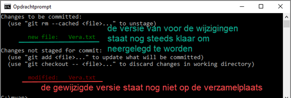 Git diff het verschil tusse de eerste versie van Vera.txt en de tweede.png