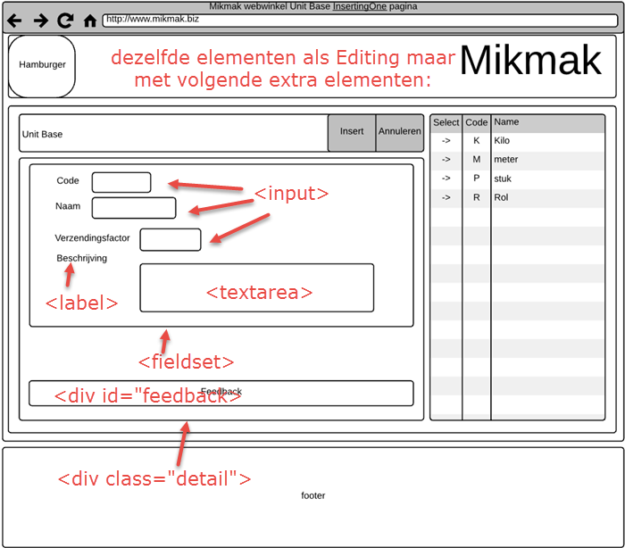 listvoeg je het fieldset element toe met daarin de label en input elementen:<div class="detail"> <fieldset> <div> <label for="UnitBase-Code">Code</label> <input id="UnitBase-Code" name="UnitBase-Code" class="text" style="width: 22.5%;" type="text" value="" required /> </div> <div> <label for="UnitBase-Name">Nom</label> <input id="UnitBase-Name" name="UnitBase-Name" class="text" style="width: 32.5%;" type="text" value="" required /> </div> </fieldset> <div class="feedback"> </div> </div>