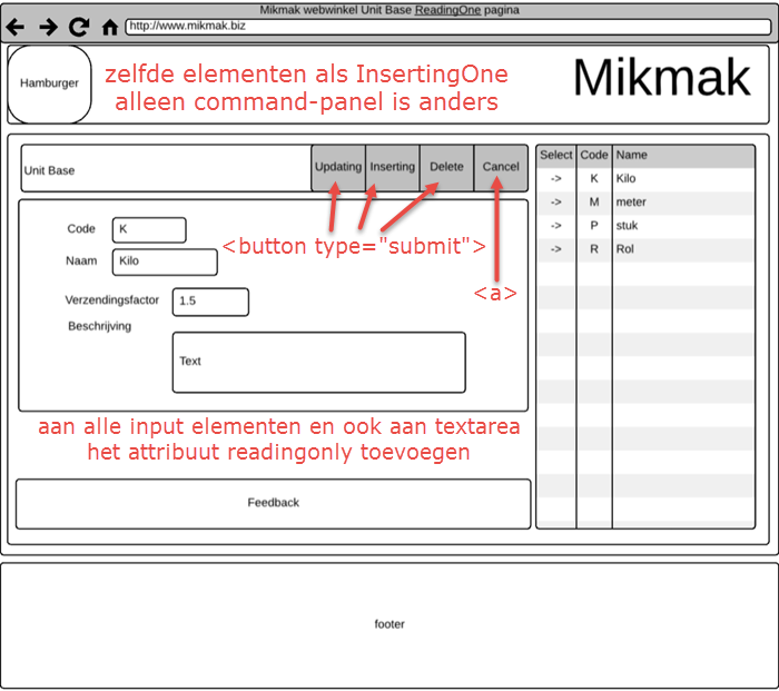 Met editing bedoelen we een pagina waarop de gebruiker een entiteit uit een platte entiteit kan selecteren, inserten, de details ervan bekijken en vervolgens kan updaten of deleten. De wireframe voor Editing vind je in Mikmak wireframes UnitBase.