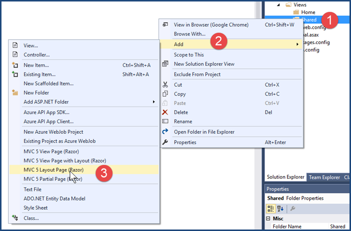 Maak een MasterLayout.cshtml bestand in de map Shared van de Views map: