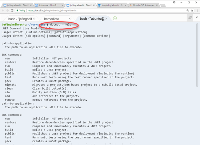 De basis van alle ontwikkeling-tools in .NET Core, de Command-Line Tools, Visual Studio, Visual Studio Code, is de Software Development Kit (SDK). Een van de onderdelen van de .NET Core SDK is de Command Line Interface (CLI), waarmee je apps kunt maken, bouwen en uitvoeren vanuit de opdrachtregel. Met de CLI kunt je je favoriete editor gebruiken om apps te creëren en je hebt verder geen zwaarder gereedschap nodig. Om te starten, installeer de gratis .NET Core SDK (verkrijgbaar bij dot.net). Dat is om mee te werken op Cloud9.