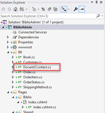Gebruik constructor-injectie zodat de deze 'geïnjecteerde' DbContext klasse gebruikt kan worden in de klasse BiblioAdmin.Pages.OrderStatus.IndexModel. Die klasse staat in het code behind bestand Pages/OrderStatus/Index.cshtml.cs bestand: