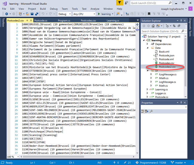 public static string SerializeObjectToCsv(List<Postcode> list, string separator) { string fileName = @"Data/Postcodes2.csv"; string message; try { TextWriter writer = new StreamWriter(fileName); foreach (Postcode item in list) { // One of the most versatile and useful additions to the C# language in version 6 // is the null conditional operator ?. writer.WriteLine("{0}{5}{1}{5}{2}{5}{3}{5}{4}", item?.Code, item?.Plaats, item?.Provincie, item?.Localite, item?.Province, separator); } message = $"Het bestand met de naam {fileName} is gemaakt!"; } catch (Exception e) { // Melding aan de gebruiker dat iets verkeerd gelopen is. // We gebruiken hier de nieuwe mogelijkheid van C# 6: string interpolatie message = $"Kan het bestand met de naam {fileName} niet maken.\nFoutmelding {e.Message}."; } return message; } - We proberen deze methode uit in de
