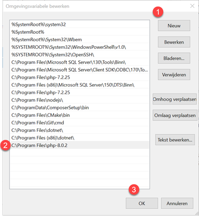 We gaan de map Program Files/php-8.0.2 dus aan de PATH omgevingsvariabele toevoegen.