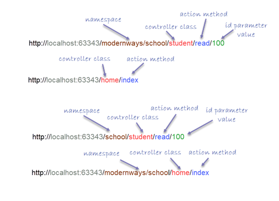 - is het laatste element numeriek dan verwijst alles wat voor het derdelaatste element komt naar de namespace, het derdelaatste element naar de controller klasse in de standaard namespace, de tweedelaatste naar de methode en de laatste is de parameter waarde; is er geen namespace opgegeven wordt de standaard namespace gebruikt;