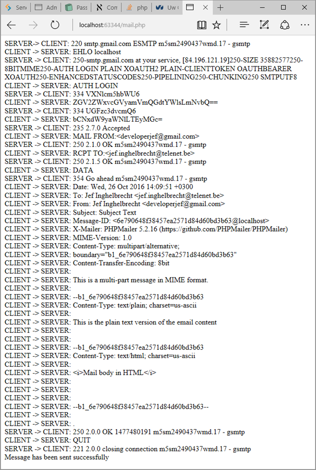 $headersstrings, omdate e-mails verzenden via demail()functie, 'geëscaped' moeten worden. In PHPMailer is dat echter zeer gemakkelijk. - Ontwikkelaars moeten ook niet de omslachtige code schrijven (escape karakters en opmaak) om bijlagenlagen en HTML-gebaseerde e-mails te versturen zoals bij de