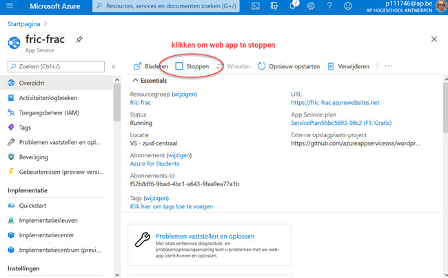 Ga naar je Dashboard en selecteer fric-frac App Service (je gebruikt natuurlijk je eigen naam):