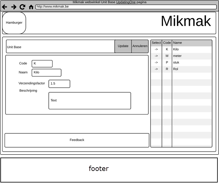 Op de wireframe zie je hoe de beheerder een nieuwe basiseenheid kan toevoegen of selecteren. In de lijst rechts, worden alle kolommen getoond waarvan de List eigenschap in de het logisch model op YES staat.